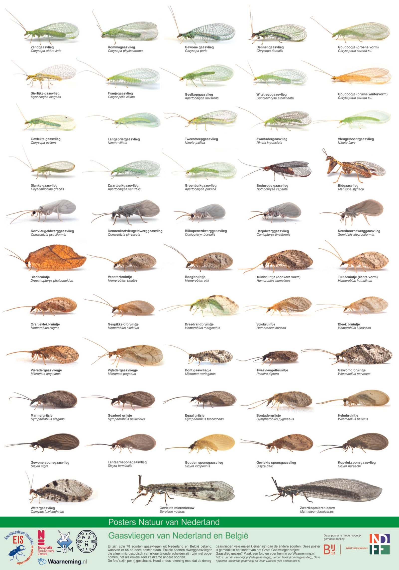 Poster op A2-formaat van de Nederlandse gaasvliegen. Foto’s van Daan Drukker, Jurriën van Deijk, Jeroen Hoek en Dave Appleton. Te downloaden als pdf of gratis af te halen bij de receptie van Naturalis aan de Darwinweg 2 te Leiden. Via de bestelknop of via eis@naturalis.nl kun je aangeven welke en hoeveel posters je wilt hebben, wij leggen ze dan voor je klaar. In verband met het formaat kunnen ze alleen vanaf 20 stuks besteld worden, voor €15,- (inclusief portokosten).